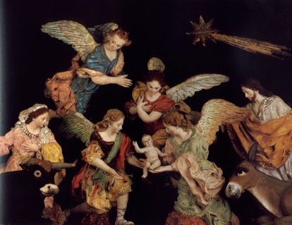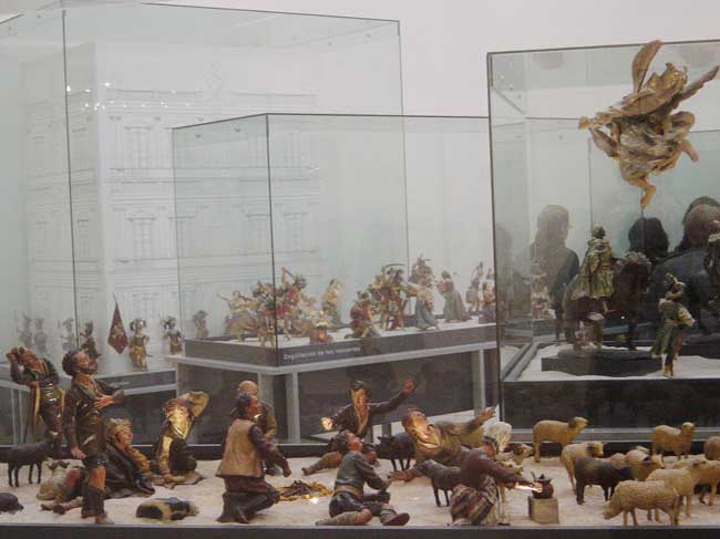 En el belén podemos observar pastores de remendadas ropas junto a unos magos deslumbrantes que se hacen acompañar de pajes vestidos con trajes dieciochescos; una nutrida guardia de Herodes y los grupos de la degollación de los Inocentes, en las que incluso el gesto y la nobleza de las expresiones delatan rangos militares e incluso sentimientos personales; el pilluelo que, encaramado en una de las columnas del pórtico toscano que le sirve de cobijo, contempla asombrado el Misterio que aparece ante sus ojos; los pastores que organizan su descanso nocturno tras la dura jornada, preparando un fuego que caldee la fría noche y sirva al mismo tiempo para asar carne con la que reponer fuerzas; la vieja que echa de comer a una manada de pavos, y de cuya boca parece brotar ese extraño y gutural sonido que durante siglos ha servido para llamar a las aves de corral quienes, incomprensiblemente, la entienden y acuden a recibir su alimento; el grupo de vacas que pastan bajo la soñolienta mirada del vaquero y en el que el artista plasma a una de ellas lamiéndose mansamente la pata, posiblemente herida por algún espino o picada por un tábano.