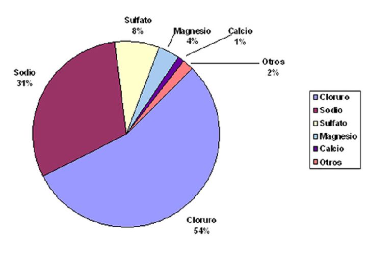 El agua de mar, de conocido sabor salado y amargo, es una mezcla que, por término medio, contiene 35 gramos de sales en cada 1.000 gramos de agua de mar (figura 1). En estos 35 gramos de sales se puede decir que aparecen prácticamente todos los elementos químicos del planeta, aunque sólo unos pocos entran a formar parte de las sales mayoritarias (figura 2) que son responsables de la salinidad. Los aniones más importantes son cloruro (Cl-), sulfato (SO2-) y bicarbonato (HCO3-), mientras que los cationes son sodio (Na+), magnesio (Mg2+) y potasio (K+). Éstos constituyen el 99,8% de las sales del mar, y la proporción en la que entran a formar parte de dicha salinidad es prácticamente constante. (Gráfico 1)
