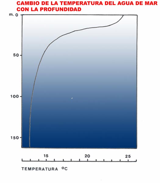 La disminución de la temperatura del agua de mar debida al aumento de la profundidad suele ser rápida durante los primeros metros y va haciéndose cada vez más lenta a medida que se alcanzan mayores profundidades (Figura 2). Esto se hace muy patente en nuestras latitudes durante el verano, percibiéndose a los 20-30 m un cambio brusco de la temperatura. A la zona que separa las dos masas de agua, la superior más cálida y la inferior más fría, se la denomina termoclina estacional, ya que son las condiciones de falta de temporales y fuerte insolación que se dan durante el verano las que permiten su formación, desapareciendo ésta con las peores condiciones climatológicas invernales. Existe una segunda termoclina alrededor de los 100 m de profundidad que no se ve afectada por las estaciones climatológicas.