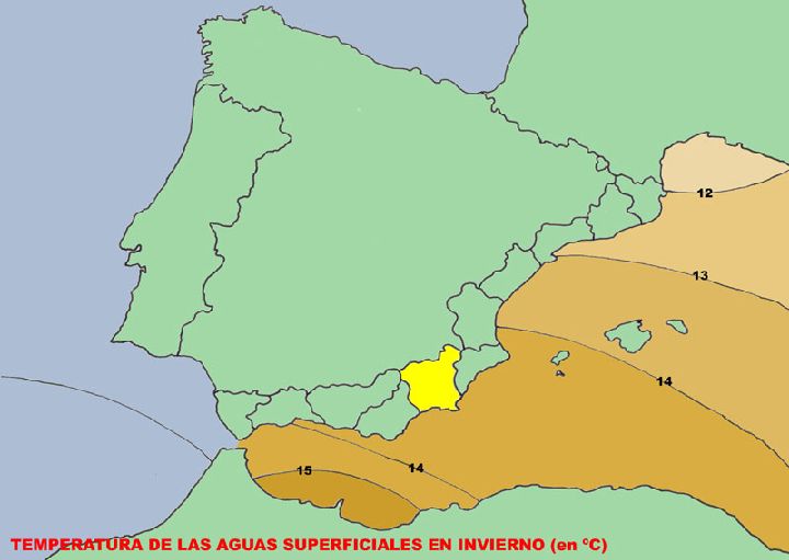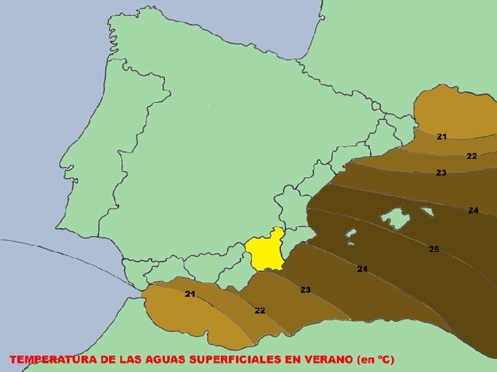 La masa de agua que baña las costas de la Región pertenece a un cuerpo de agua más amplio cuyas características proceden de estar sometido a un clima especialmente cálido y seco y de permanecer fuera de la influencia del agua atlántica entrante. El resultado es que dicho cuerpo presenta valores de temperaturas superiores a las masas de agua colindantes.