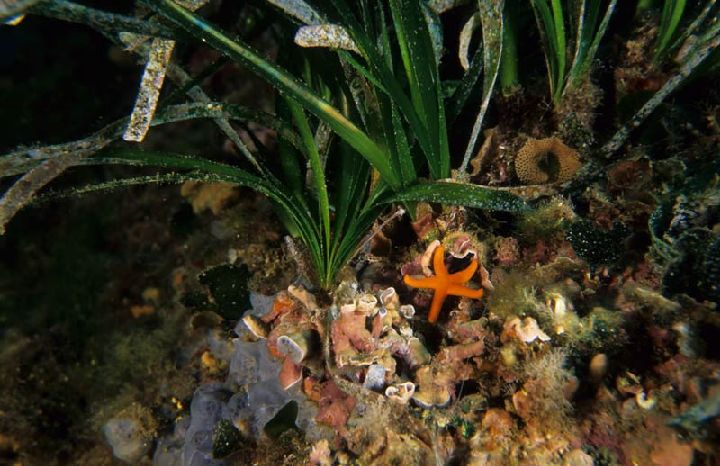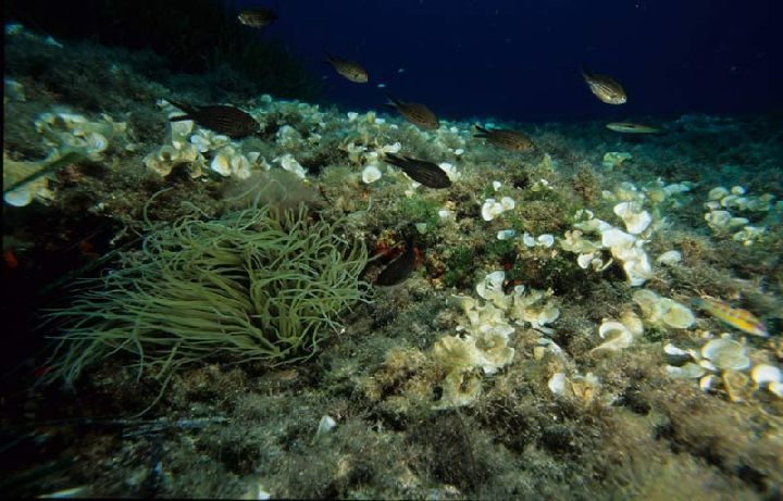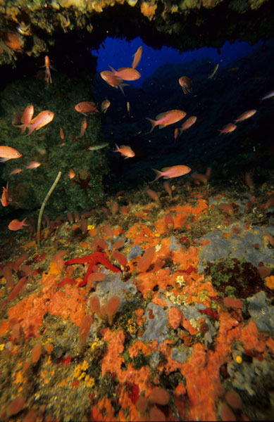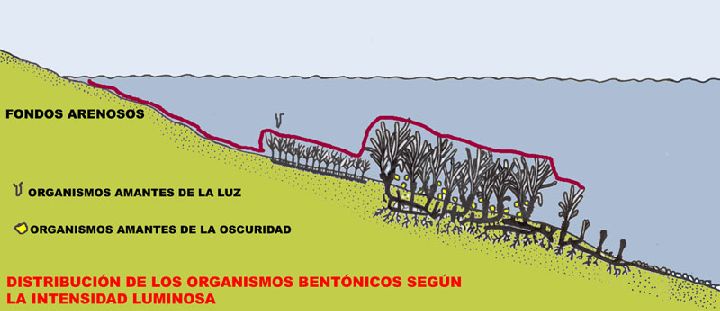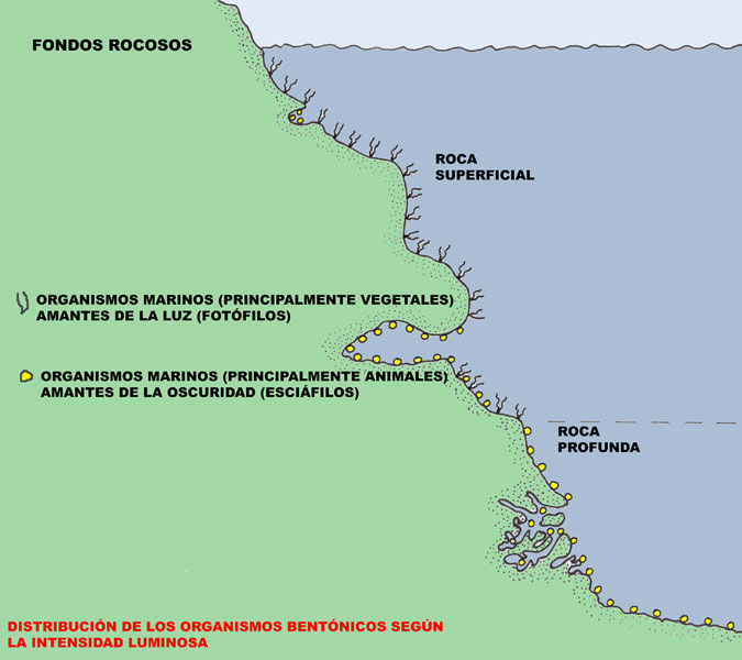 El resto de los organismos presentan adaptaciones a una intensidad y calidad de luz determinada, condiciones que buscarán según sea su capacidad de desplazamiento. Así, los que viven fijos al fondo (organismos bentónicos) se desarrollan en aquellos enclaves donde, ya por su profundidad, ya por sus características estructurales (grutas, extraplomos, paredes inclinadas, etc.), se dé la iluminación que necesitan (figuras 5, 6, 7, 8 y 9). En cambio, aquellos que tienen libertad de movimiento buscarán ese óptimo mediante desplazamientos verticales, condicionados éstos por los ciclos diurno y estacional.