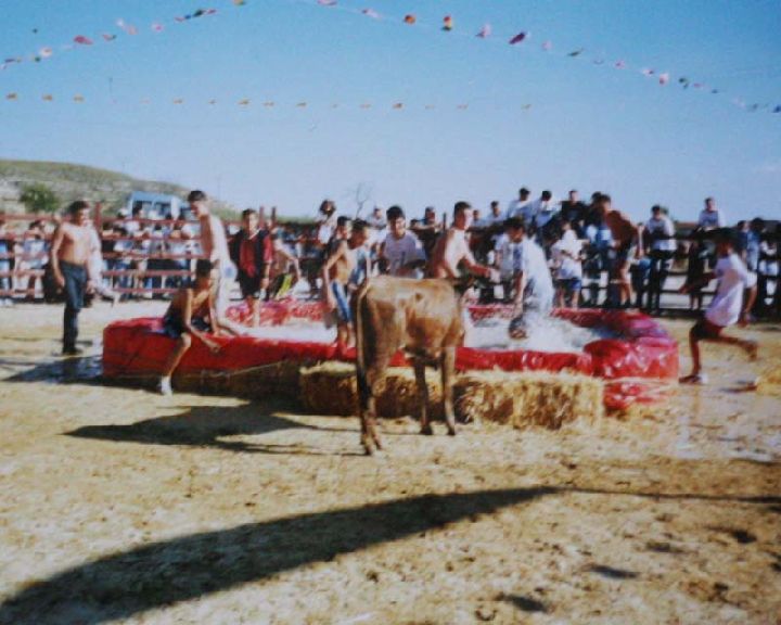 Otra actividad muy peculiar que forma parte del programa anual es la de la vaquilla en la balsa consistente en mediar de agua una piscina de plástico y soltar una vaquilla dentro. Los mozos del pueblo tienen la oportunidad de demostrar su valor y divertirse, zambulléndose junto a la vaquilla en el agua.