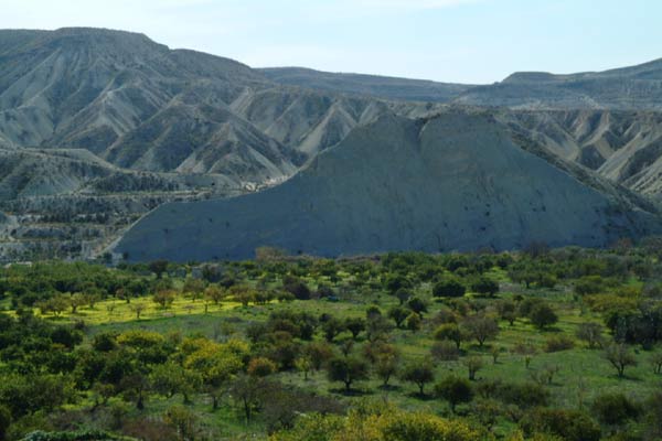 El paisaje más característico de Campos del Río es el compuesto por una red de Badlands o "paisaje lunar", que ejerce un fuerte contraste con el valle del Río Mula, a lo largo del cual brota una huerta esplendorosa, que resalta por su verdor frente a la escasa vegetación que presentan los barrancos.