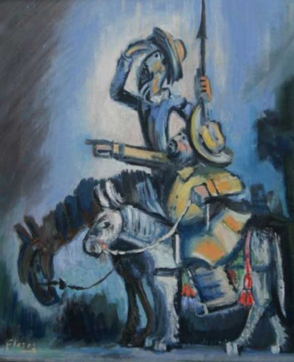 La tradición francesa fue precursora de la atención prestada al Caballero de la Triste Figura, desde que en 1614 apareciera la primera versión fuera de España, hasta que en el siglo XX se filmara la película de Georg Wilhelm Pabet (1933) para la que el músico Jacques Ibert compusiera la banda sonora aceptada. Precisamente para la puesta en escena de esa partitura, representada en forma de ballet con el título de Le chevaier errant, hizo Pedro Flores los decorados y vestuarios en el marco del interés que siempre tuvo por el Siglo de Oro y, en especial, por la figura del Quijote, del que realizó varios cuadros al óleo y una serie de acuarelas y gouaches pretendidamente destinadas a ilustrar algún día una nueva edición del inmortal relato.