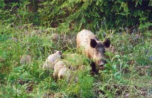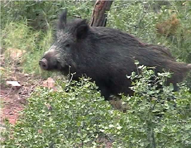 El Jabalí es el antepasado del cerdo doméstico. Tiene un cuerpo compacto, de color marrón o negruzco, del que destaca su gran cabeza cónica provista de un morro cilíndrico acabado en una jeta, que utilizan para levantar y remover el suelo buscando su alimento. Poseen un gran olfato y una dentadura adaptada a su dieta omnívora, destacando en los machos adultos los colmillos, largos, estando los de la mandíbula superior, vueltos hacia arriba. En éstos aparecen algunas zonas plateadas de la cara y del dorso, canosas. El pelaje que cubre su cuerpo es denso, y los pelos son duros, por lo que recorren el interior de zarzales y matorrales espinosos sin inmutarse. Son frecuentes junto a charcas que utilizan de revolcaderos el encontrar la corteza de los troncos de encinas o pinos, desgastada, llenas de barro, como resultado de restregarse los costados contra ellos.
