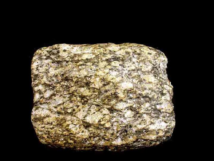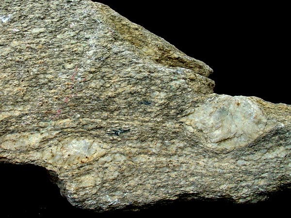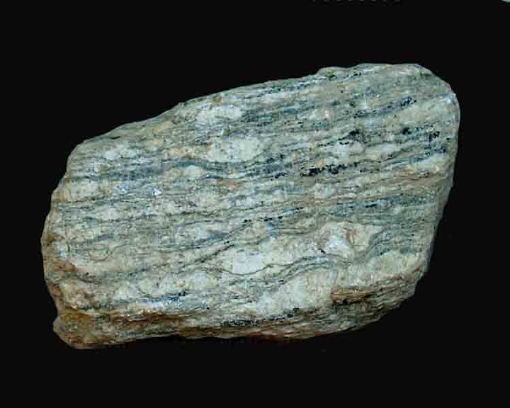 Roca de grano grueso a medio, con textura planar grosera (textura gneísica), que origina un bandeado composicional alternante de capas de minerales claros (feldespato potásico mayor del 20%, albita, cuarzo y moscovita) y capas de minerales oscuros (biotita, anfíboles, turmalina, andalucita, sillimanita, cordierita, granate, etc.).