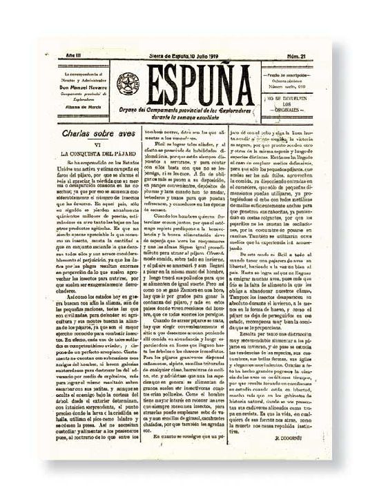 El 8 de julio de 1917, ve la luz el folleto diario Espuña, como cita en su subtítulo "Órgano del campamento provincial de los exploradores durante las semanas escultistas". En aquel entonces, el precio de la suscripción era de 80 céntimos y cada número suelto costaba un céntimo. Durante su tercer año, concretamente el 7 de julio de 1919, D. Ricardo Codorníu envía dos textos. Uno de ellos contempla la obra Las Golondrinas; tragicomedia de malas costumbres, y el otro sería Charlas sobre aves I, la primera de sus 11 conferencias que posteriormente en 1920, se reunirían en un libro dedicado al mundo de las aves. Las charlas se denominaron: "El equilibrio de los seres, generalidades sobre aves, el plumaje, nidos, emigraciones, fotografías de aves, la conquista del pájaro, protección a las aves útiles, el día del pájaro, nidos artificiales y aves murcianas".