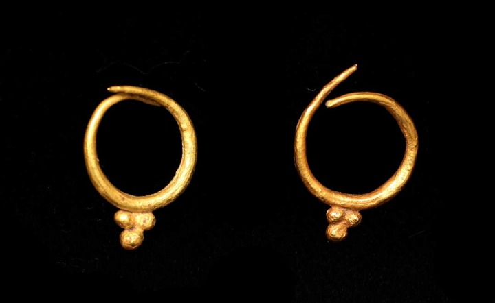 Pendientes de oro con forma de racimo de uvas, que formaba parte del ajuar de la sepultura nº 209 de la Necrópolis del Poblado del Conjunto Arqueológico de Coimbra del Barranco Ancho, junto varias hebillas de hierro y punzones de hueso.