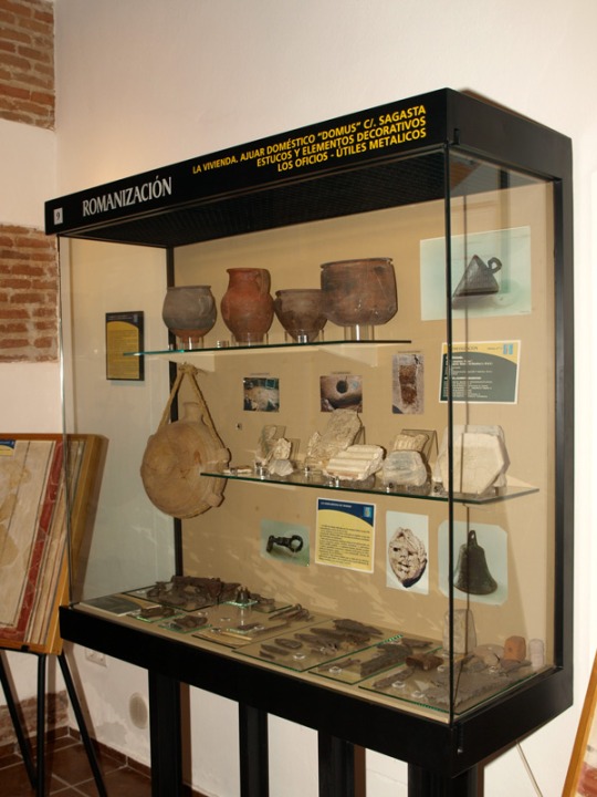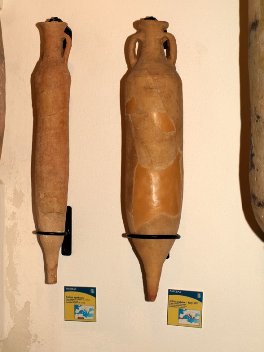 Estos diferentes períodos quedan constatados con los descubrimientos arqueológicos en tierra. Restos arquitectónicos de dos edificios termales al inicio de la época imperial, uno de ellos reutilizado a partir del siglo IV d.C. provechando sus espacios y la zona de calderas para instalar hornos cerámicos de ánforas (spatheion) de producción local para la exportación de las salsas garum y las salazones, además de para la producción de estos productos, reconvirtiendo todo el área en una zona industrial.