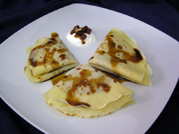 Las crêpes francesas, o filoas gallegas, son unas sencillas tortitas finas que pueden ser rellenadas de dulce o salado, generalmente de alguna compota o mermelada. En este caso las presentamos rellenas de arrope y calabazate y con una reducción del arrope a manera de sirope.