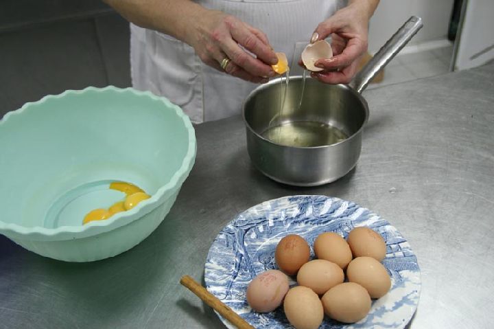 - En un cuenco profundo, se colocan las diez yemas de huevo. Se rompen y se mezclan, sin llegar a producir espuma. Luego se añade poco a poco el almíbar, que debe estar frío, para que no cuaje el huevo. Se mueve bien para que el conjunto quede bien mezclado.