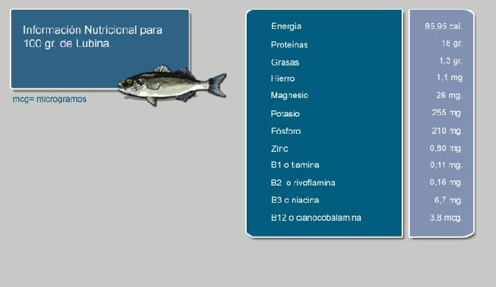 La lubina es uno de los pescados de carne blanca con un porcentaje menor de aportes de grasa ya que sus cifras se aproximan a 1,3 gramos cada 100. A esta característica, beneficiosa para el consumo por parte del ser humano, se le une un elevado contenido de proteínas de alto valor biológico, vitaminas y minerales, quedando este pescado entre los alimentos con mayor valor nutritivo tras una elaboración sencilla en cocina, de ahí que forme parte de dietas bajas en calorías.
